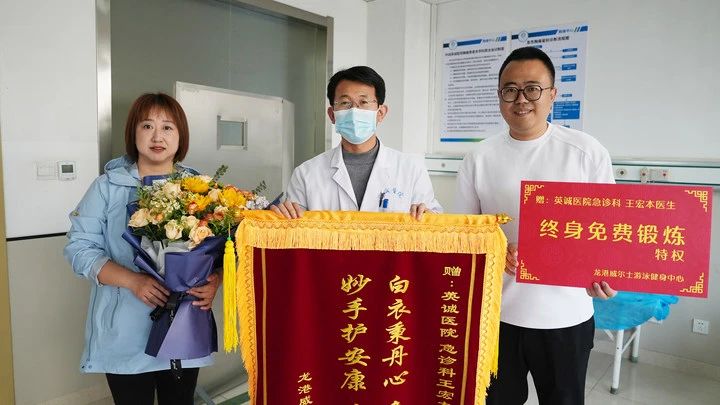“也就不到一分钟吧,您就冲了上去,给晕倒的人做了心肺复苏,有了自主呼吸,多亏了您专业及时抢救!”5月14日上午,龙口市威尔士健身俱乐部的店长手捧鲜花和锦旗,专程来到玲珑英诚医院急诊科来向王宏本医师表示感谢,激动及感激之情难以言表。