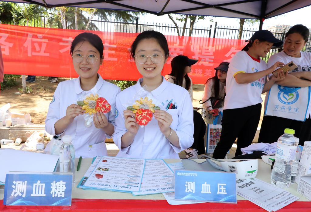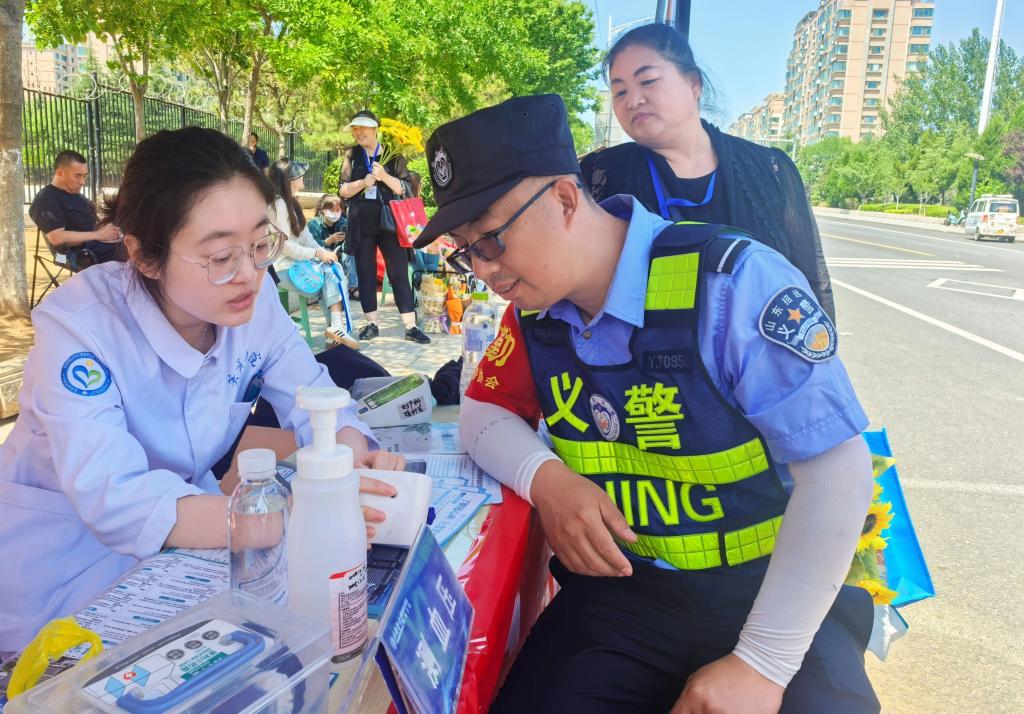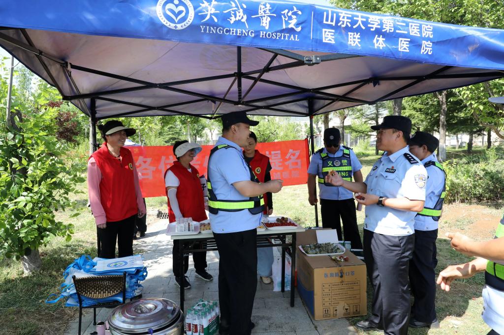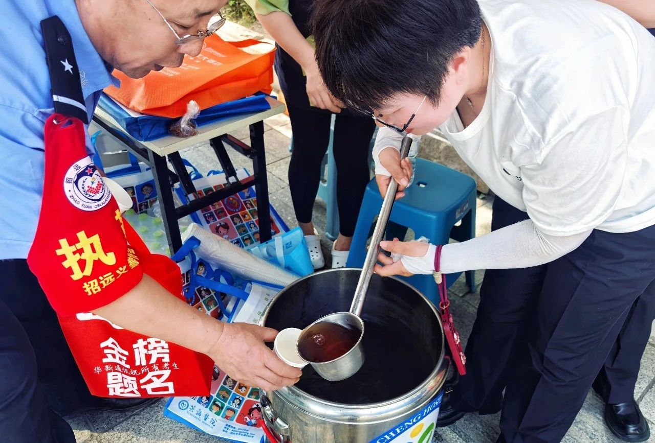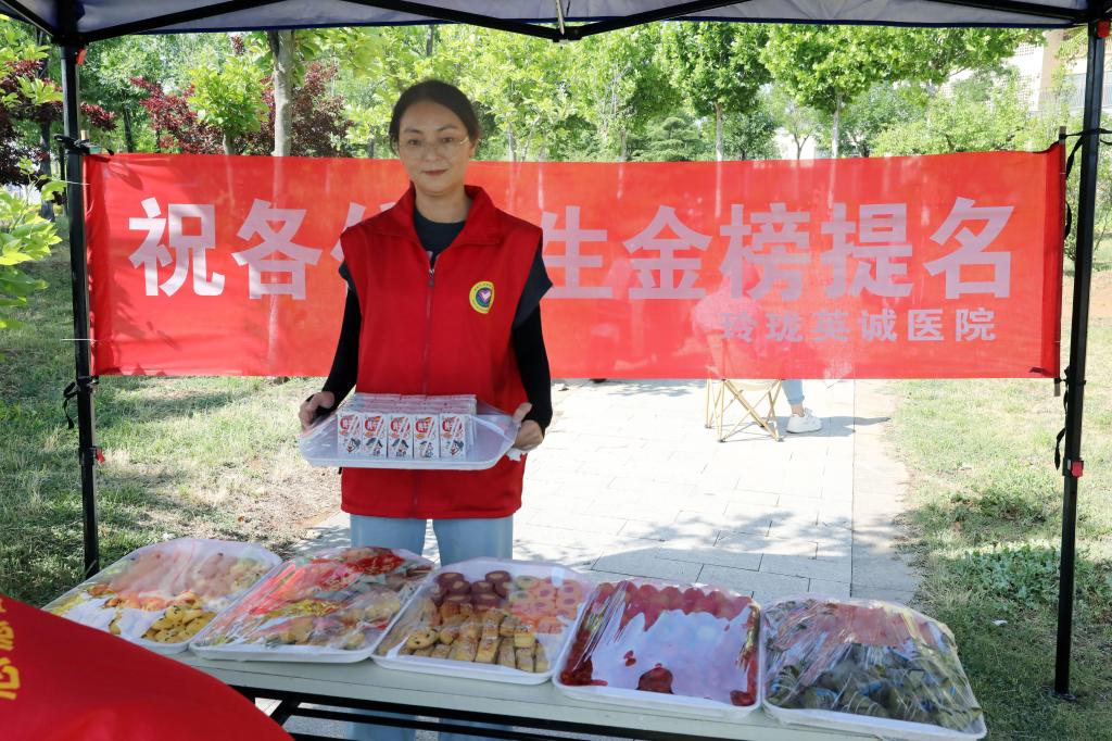破晓时分,医院工作人员与志愿者们便迎着晨曦,早早抵达招远一中和招远二中考点。他们迅速搭建起服务站,有序摆放物资,精心筹备各项服务。现场不仅为考生和候考家长准备了防暑降温药品、口罩、矿泉水、手提袋等实用物资,医院餐厅还制作了寓意 “一举夺魁”“金榜题名” 的特色小糕点,搭配清凉爽口的果盘与绿豆汤,为炎炎夏日带来丝丝沁凉。此外,护士们化身健康守护者,耐心地为考生家长测量血压、血糖,同时发放急救知识宣传材料,将专业的医疗关怀与贴心的健康指导送到家长身边。这些细致入微的服务,不仅覆盖了考生与家长,还惠及了坚守岗位的警察、义警、保洁人员、城管队员等一线工作者,彰显了大爱与担当。
