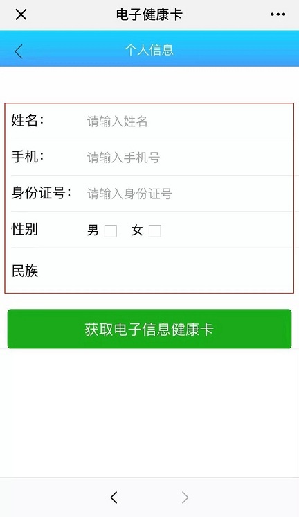 用户登录我院微信公众号后,点击“医健通”-“电子健康卡”,输入个人信息后即可生成居民电子健康卡。居民通过该卡可以查看自己的健康档案、就诊记录、签约医生,进行预约挂号,了解医院义诊活动,获取所在地的环境健康信息和收听收看健康讲座。同时,通过同步绑定医院的就诊卡,可将医院的就诊信息和档案同步在“医健通”上,实现全面健康管理。