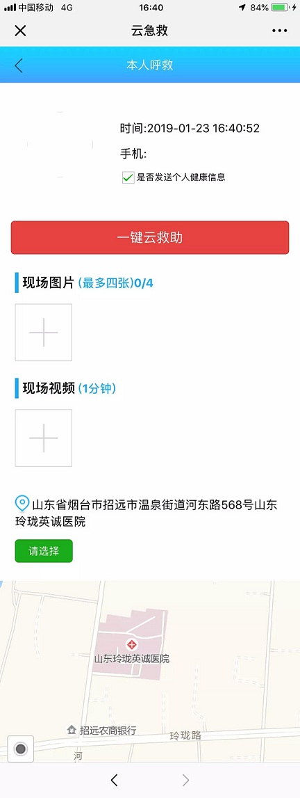 在进行“本人呼救”和“帮他人救助”时,用户可以选择同步发送本人健康信息,并发送现场照片和视频、定位自己的准确位置。点击“一键云救助”后,用户还可以根据页面提示拨打120进行语音呼救.