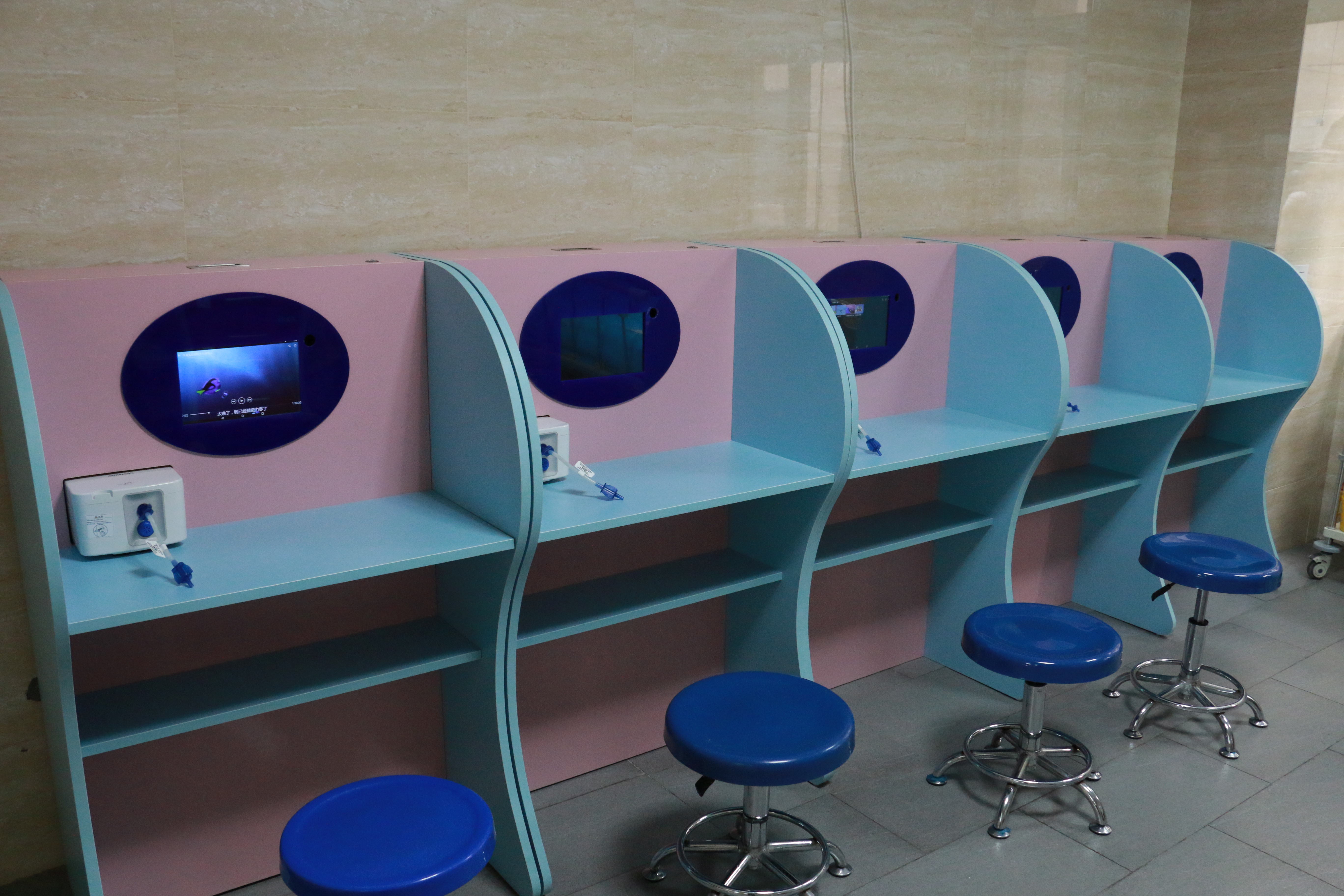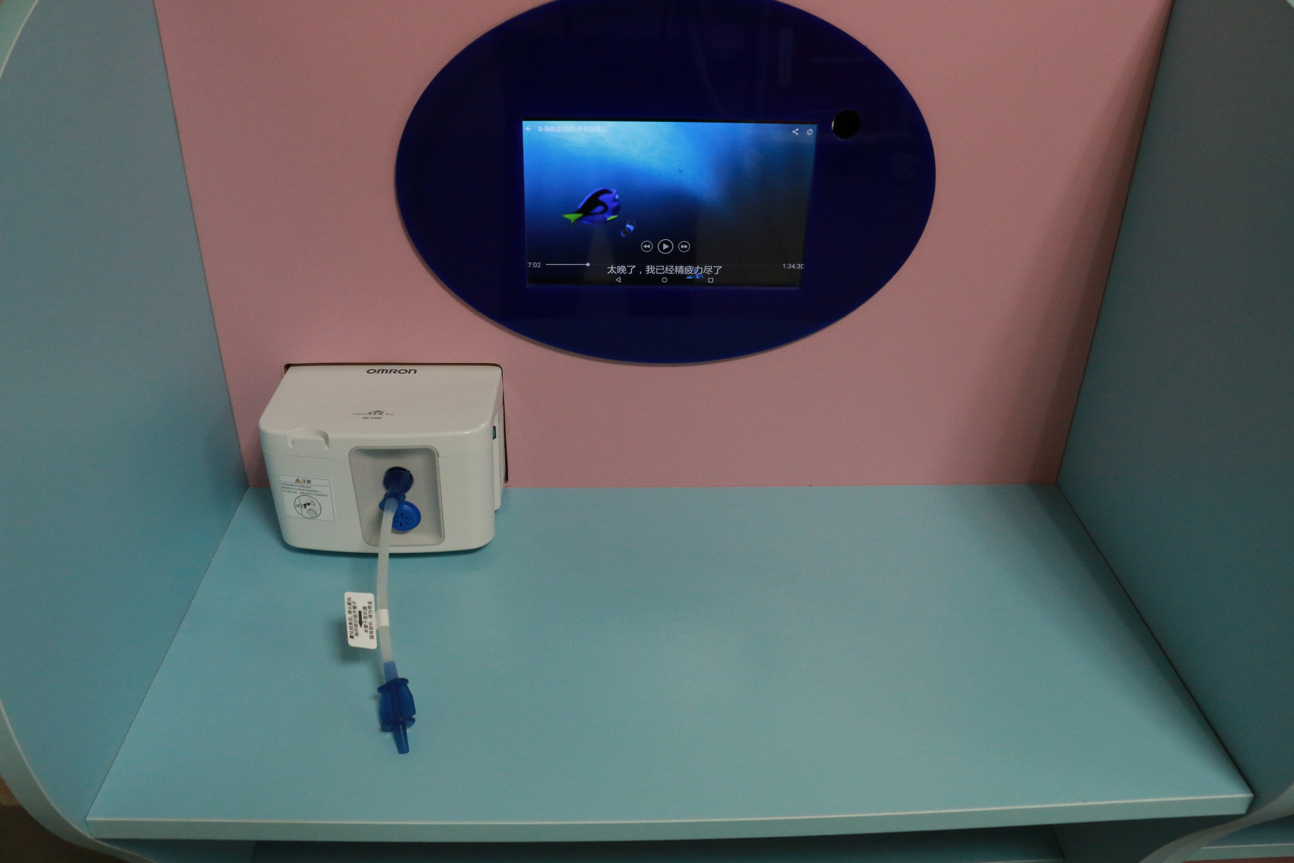 儿童雾化室位于英诚医院门诊二楼儿科内,环境舒适,室内宽敞明亮,可同时进行5名患儿雾化吸入。可爱的马卡龙色让现场看起来非常温馨,且充满童趣。雾化室为卡位设计,每个卡位上设有一台雾化机,且每个卡位上都配备了视频播放设备,患儿可以在雾化过程中看视频、玩游戏,在愉悦的气氛中完成治疗,缓解了患儿在雾化过程中的哭闹等不配合问题,保证每次雾化的质量和疗效。卡位设计也让空间相对独立,减少了交叉感染。