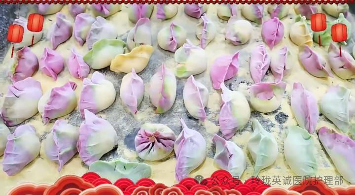 活动刚开始,大家热情高涨,马上投入包饺子大赛。护士长们分工明确,配合默契。擀面皮的手法娴熟,面团很快变成薄圆面皮。包饺子时,大家用菠菜、紫薯、胡萝卜汁和面粉,做出翠绿、淡紫、橙黄等彩色面团,再擀成饺子皮包出饺子。这些饺子整齐排列,就像艺术品,饱含着对美好生活的向往。众人一起包饺子,年味儿十足,仿佛回到阖家团圆时刻。护士长们看着亲手包的彩色饺子,满是成就感。饺子出锅后,护士长们赶紧把饺子送给医养中心的老人,还送上节日祝福。老人们收到饺子,心里暖乎乎的,真切感受到医院的关怀。之后,全体护士长围坐品尝劳动成果,大家脸上都挂着幸福笑容,现场十分温馨。