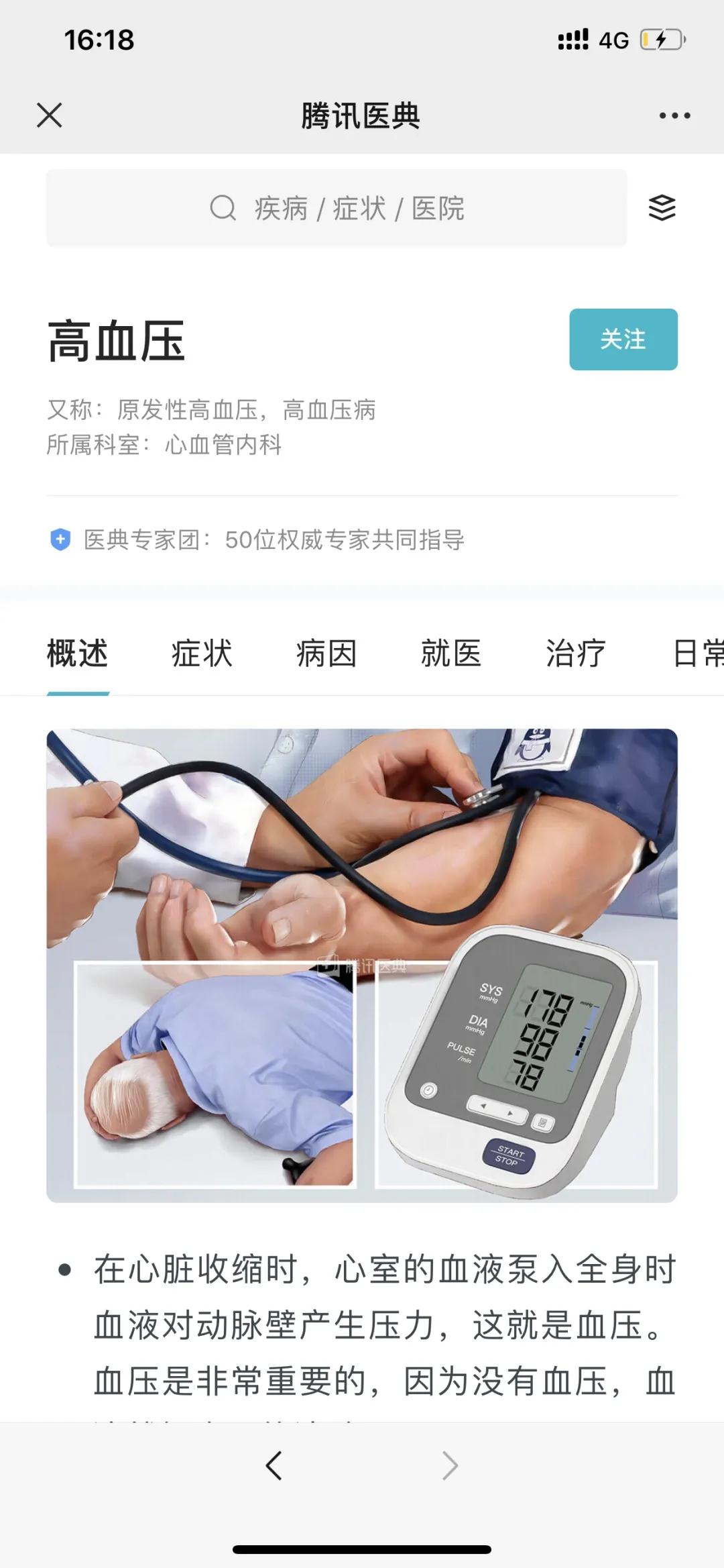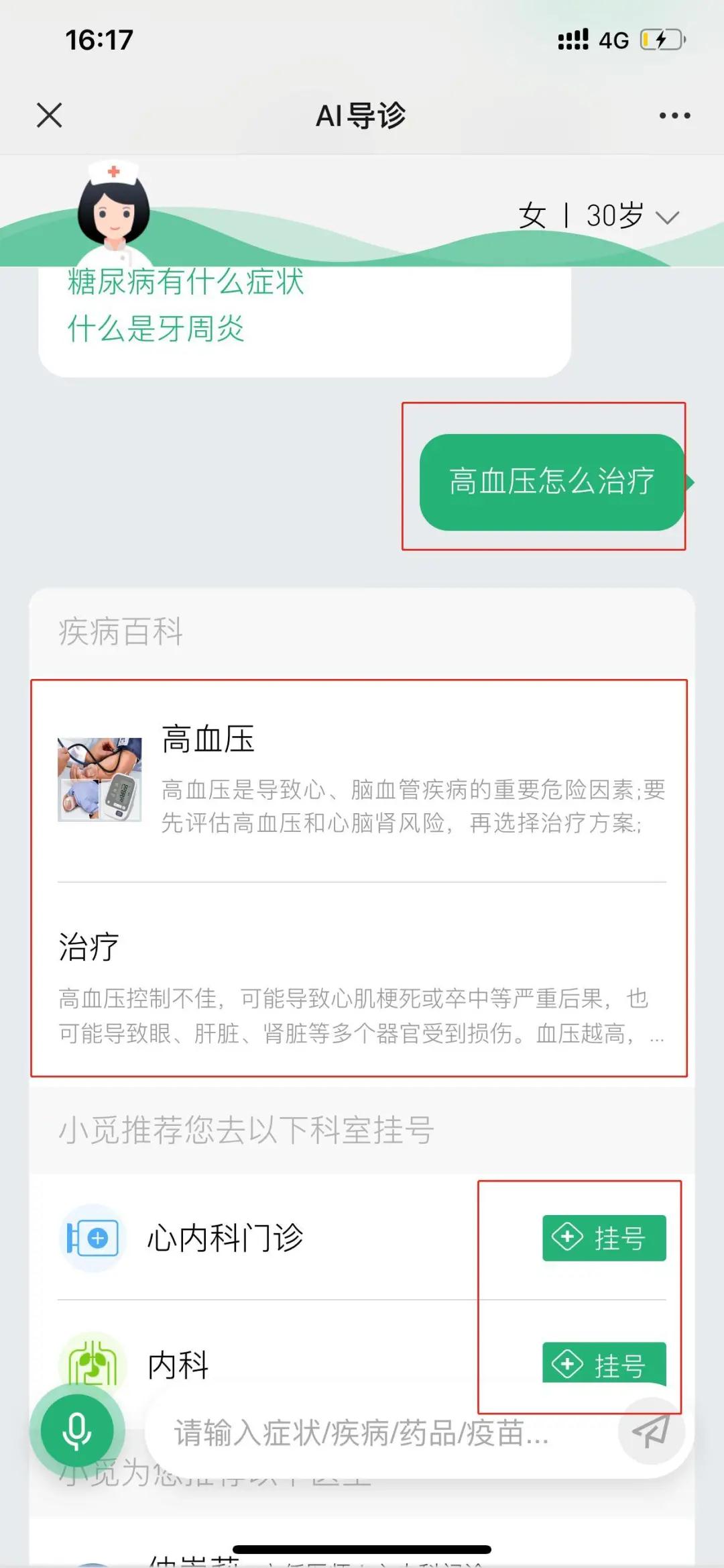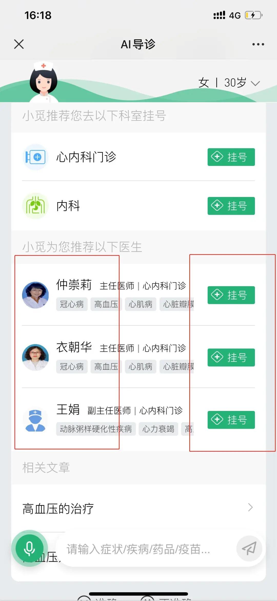 点击界面首页“智能问病”,或直接输入疾病相关问题,即可获取疾病知识。例如输入“高血压怎么治疗”,即可弹出疾病治疗知识和推荐的相关科室和医生。如需问诊,可点击“挂号”进行预约。