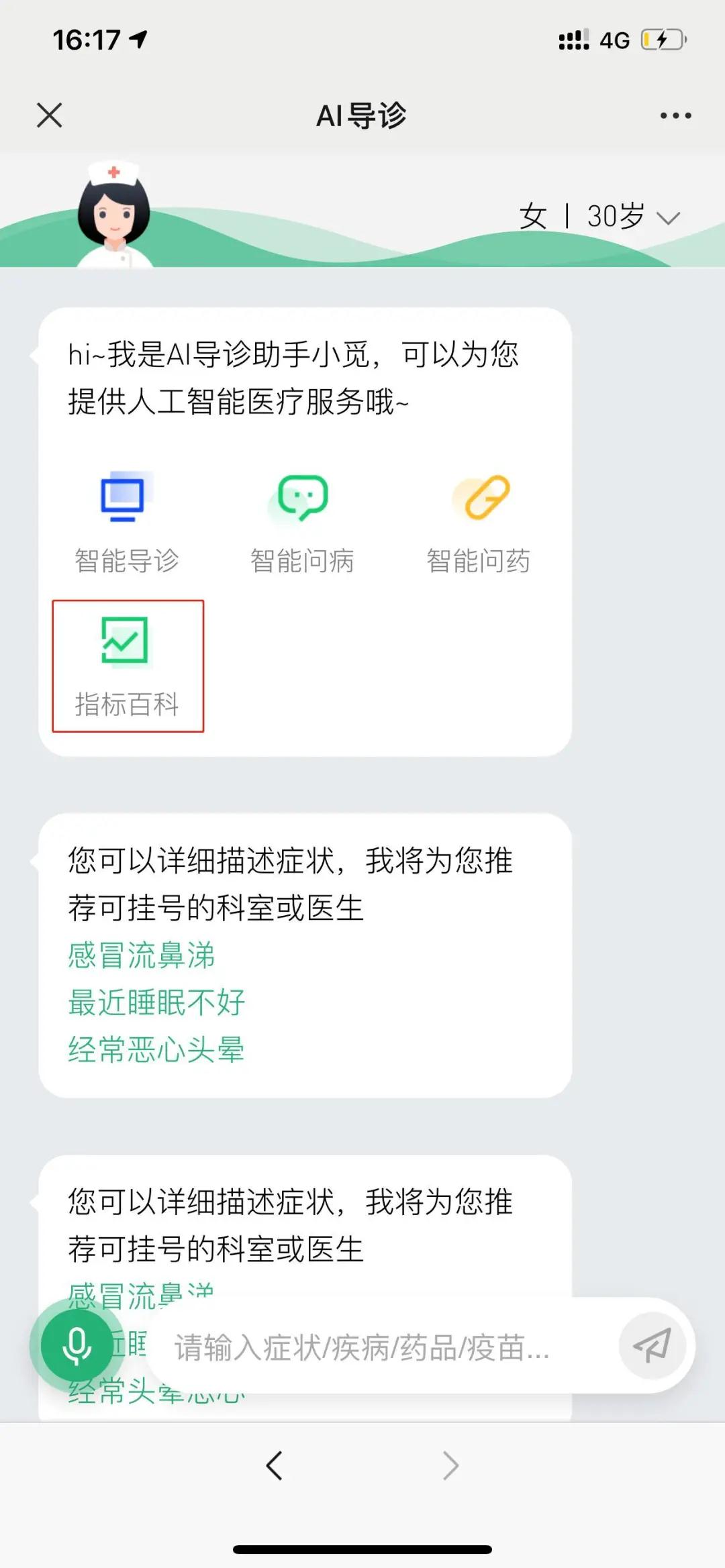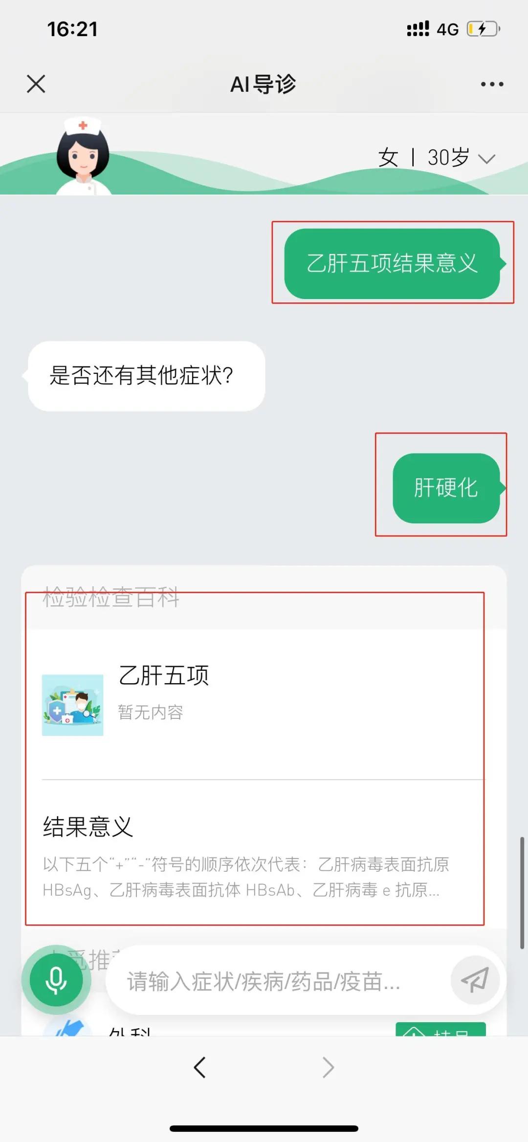 该功能可以查询检查指标的相关知识。点击界面首页“指标百科”,或直接在输入框输入需要查询的信息,例如输入“乙肝五项结果意义”,即弹出相关介绍;如需问诊,点击弹出相关科室和医生推荐进行预约“挂号”。