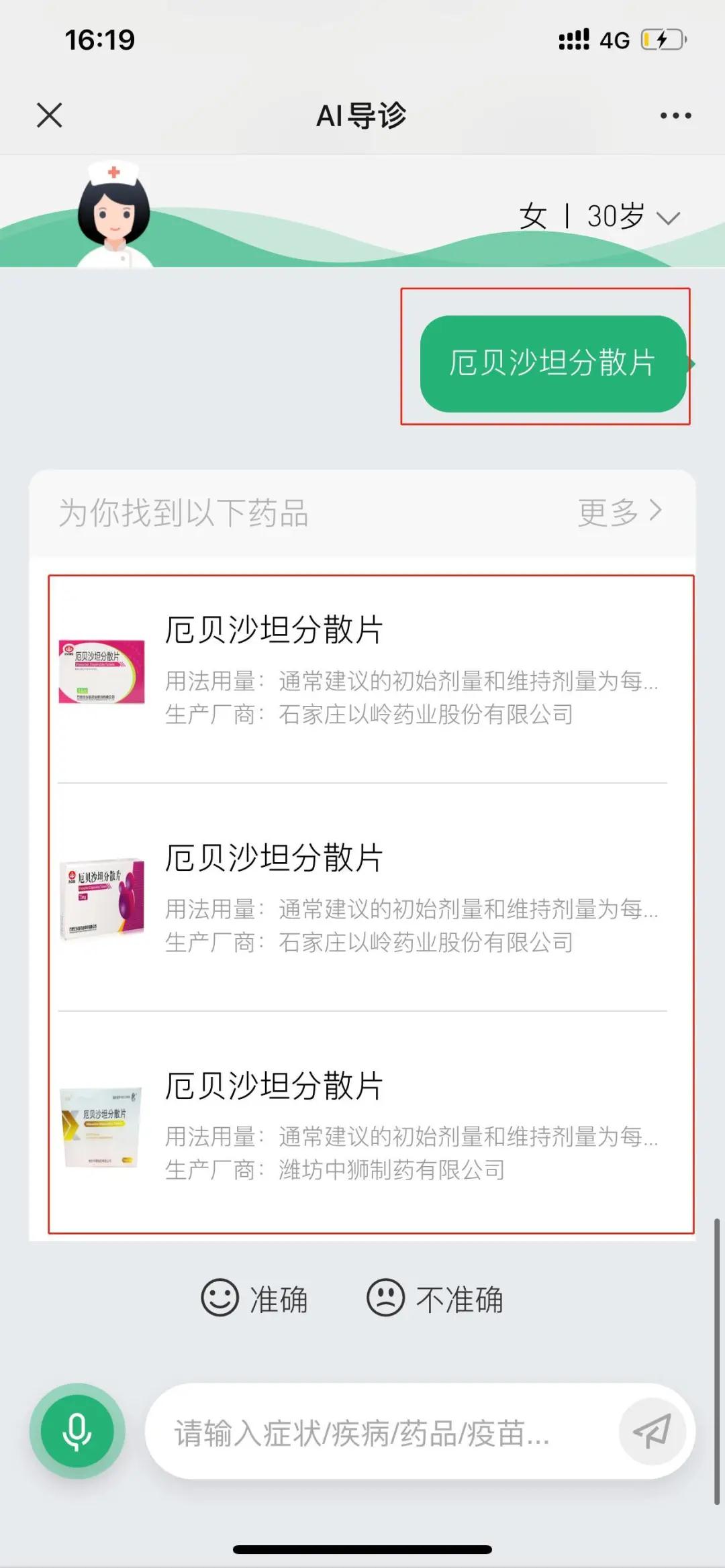 该功能可以查询药品的详细信息,点击界面首页“智能问药”,或直接在输入框输入药品名称,例如输入“厄贝沙坦分散片”,即弹出药品介绍。