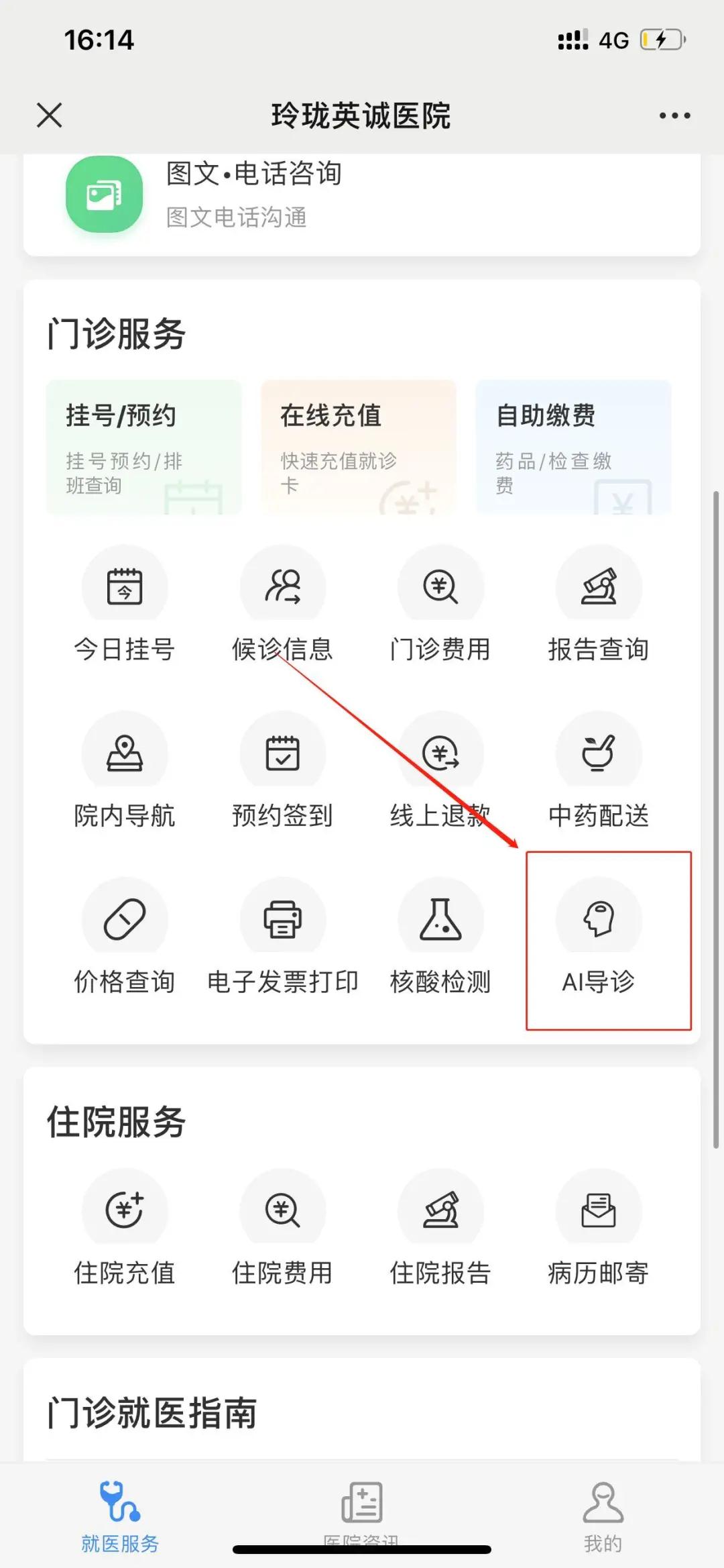 2.点击菜单“就医服务”-“诊疗服务”-“AI导诊”;