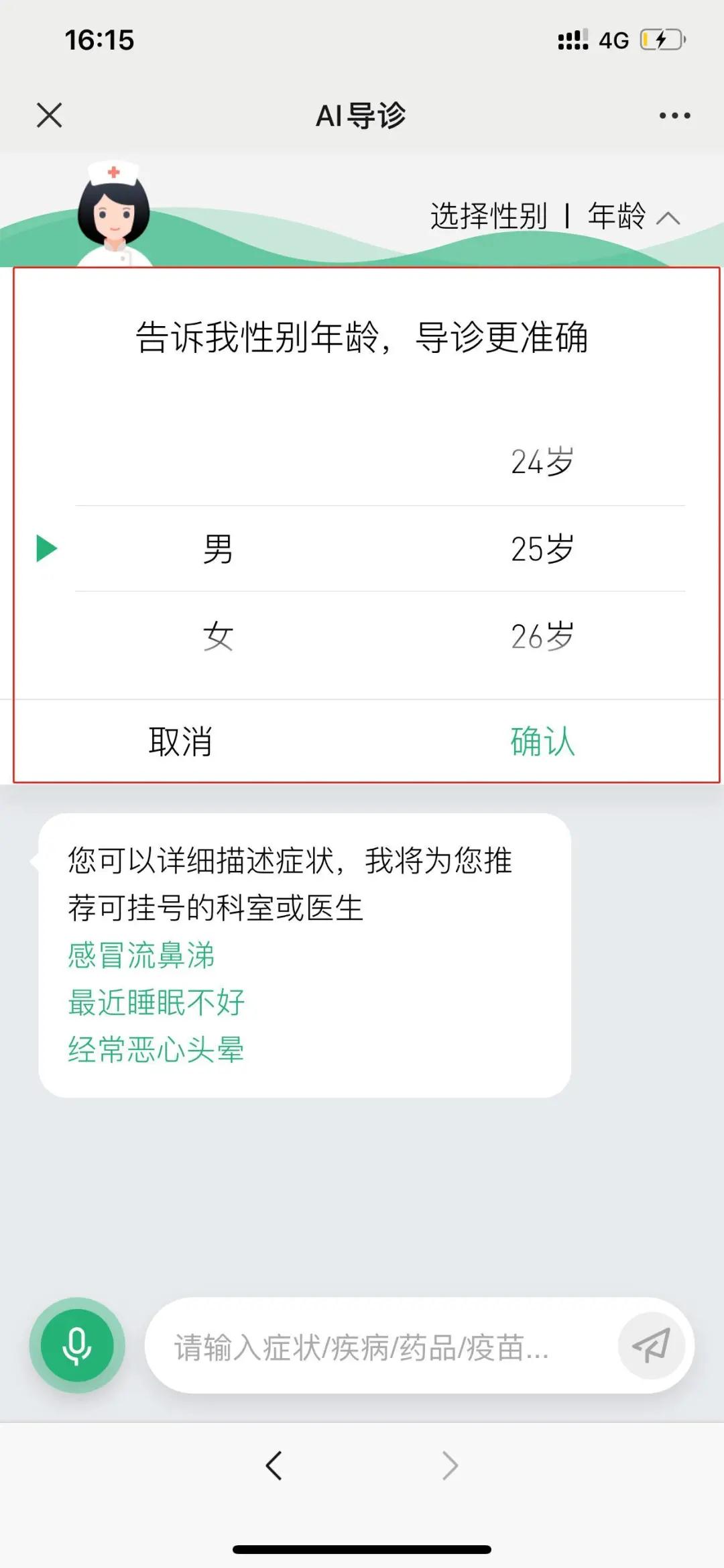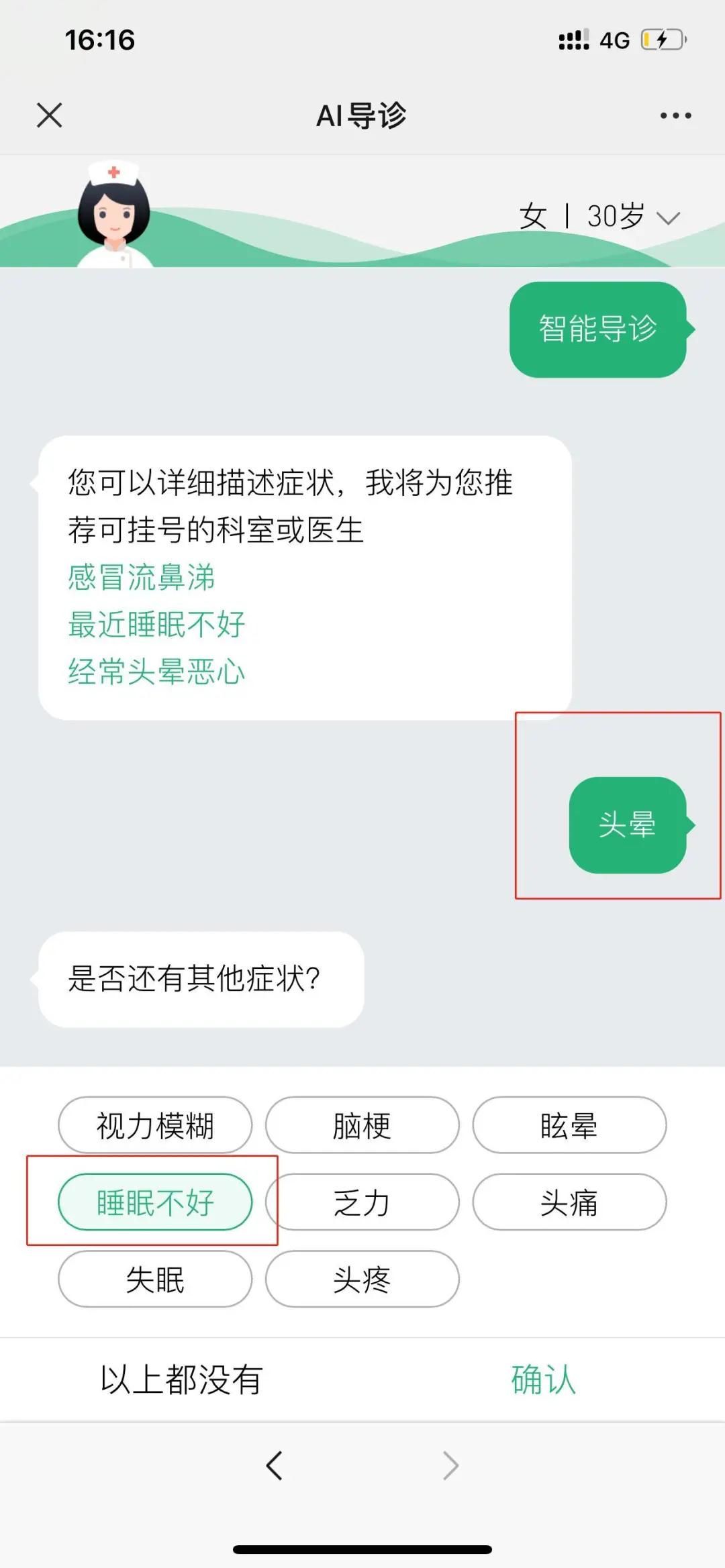 1.在输入框语音或文字输入症状,如“头晕”,点击发送,这时AI会自动询问是否有其他症状,例如补充“睡眠不好”后,点击确认。