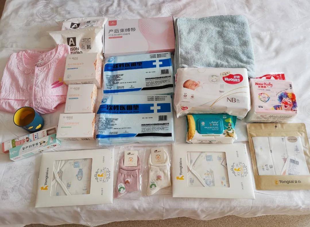 产妇专用牙刷*2、牙膏*1、棉袜*2双、一次性产褥垫*10片、马桶垫*1个、防溢乳垫*1包、一次性内裤*1包、母乳储存袋*10个、毛巾*2条、宝宝服*1套、纸尿裤S码*1包、洗脸盆*1个、PP盆*1个、新生儿洗护套装*1套、奶瓶刷*1支、奶嘴刷*1支、浴巾*1条、口水巾*2条、湿纸巾*1包、面巾纸*1包