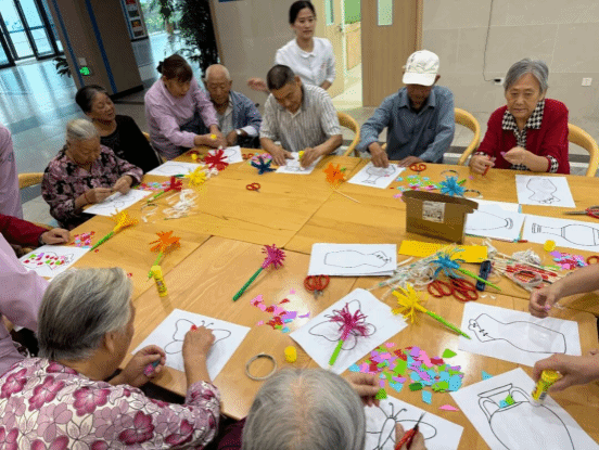 手工DIY(折纸、石膏彩绘)、纸杯飞扬、套圈……在欢声笑语中,长者们彼此熟悉、互帮互助。不少独居长者说:“和大家一起做事,心里暖了,也不孤单了。”