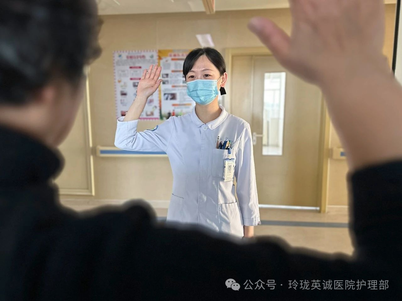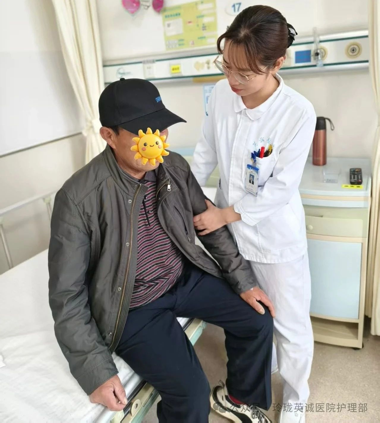 19号作品:《柔眸暖护》护士脚步轻盈,双手稳稳地伸向患者,嘴角一抹温柔笑意,轻声细语:“来,慢慢起身,我扶您。”