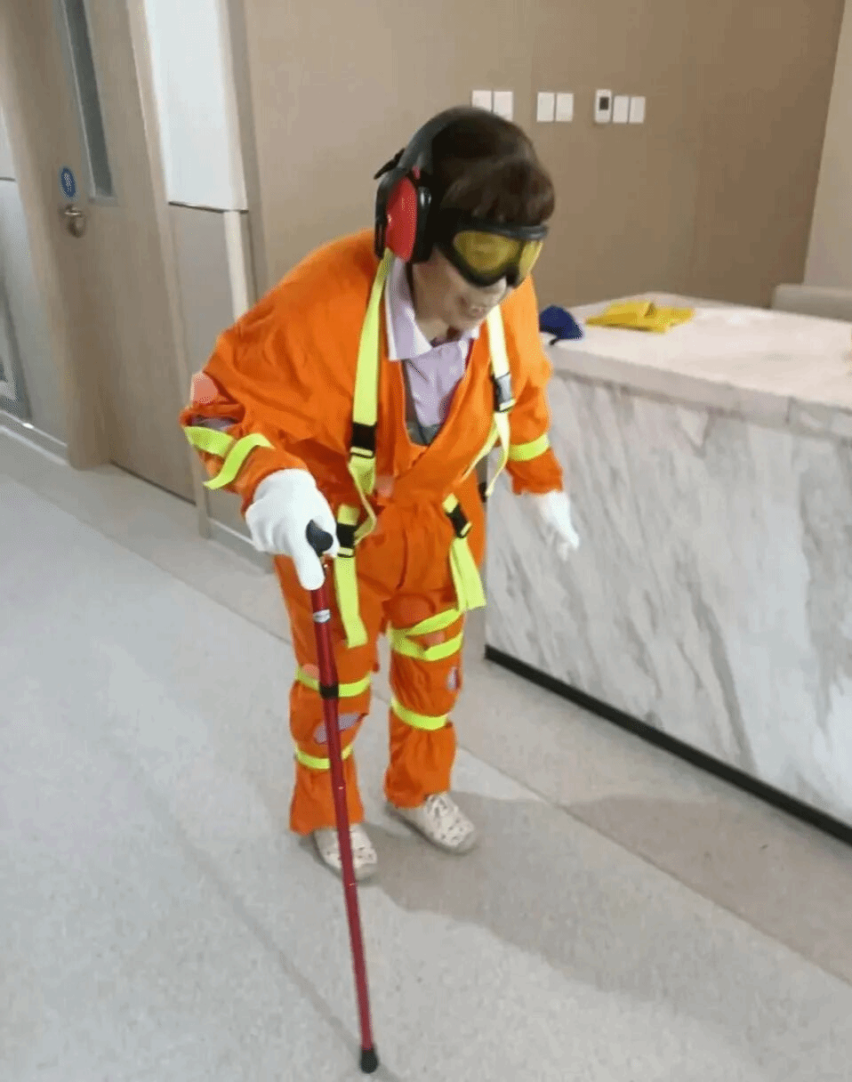 这是英诚医养中心特意组织的共情体验活动。我们穿的这套衣服,也叫老年体验服、模拟老化服。负重模块复刻着老年人肌肉衰退后的沉重,特殊护目镜模拟着视力模糊的朦胧,关节处的束缚则精准还原了行动时的滞涩与隐痛——全套装置合力,将80岁老人的身体状态搬到了我们这些年轻人身上。