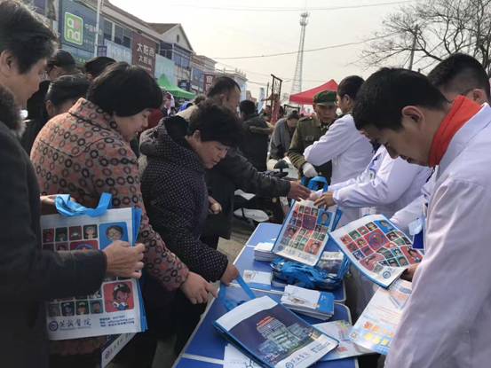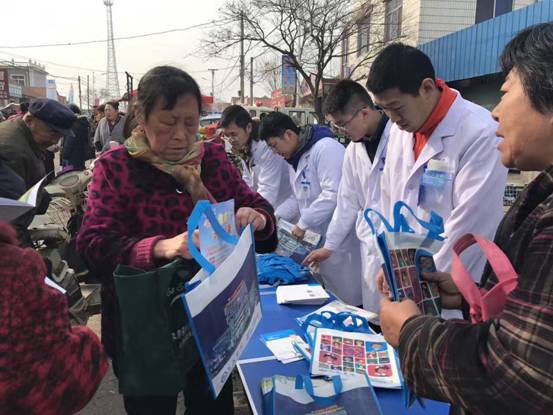 3月30日,普外科医生到辛庄镇集市为百姓义诊,发放健康知识手册,并详细解答了患者关于肿瘤疾病的疑问。